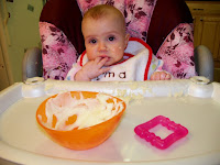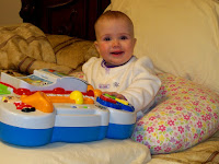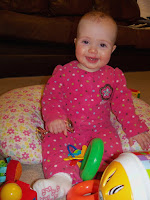Emily is trying to crawl. This isn't her only accomplishment of late. She now has her two bottom baby teeth, can clap and blow raspberries. We love guacamole, mashed potatoes and of course bread. She loves to be the center of attention and grin and giggle.